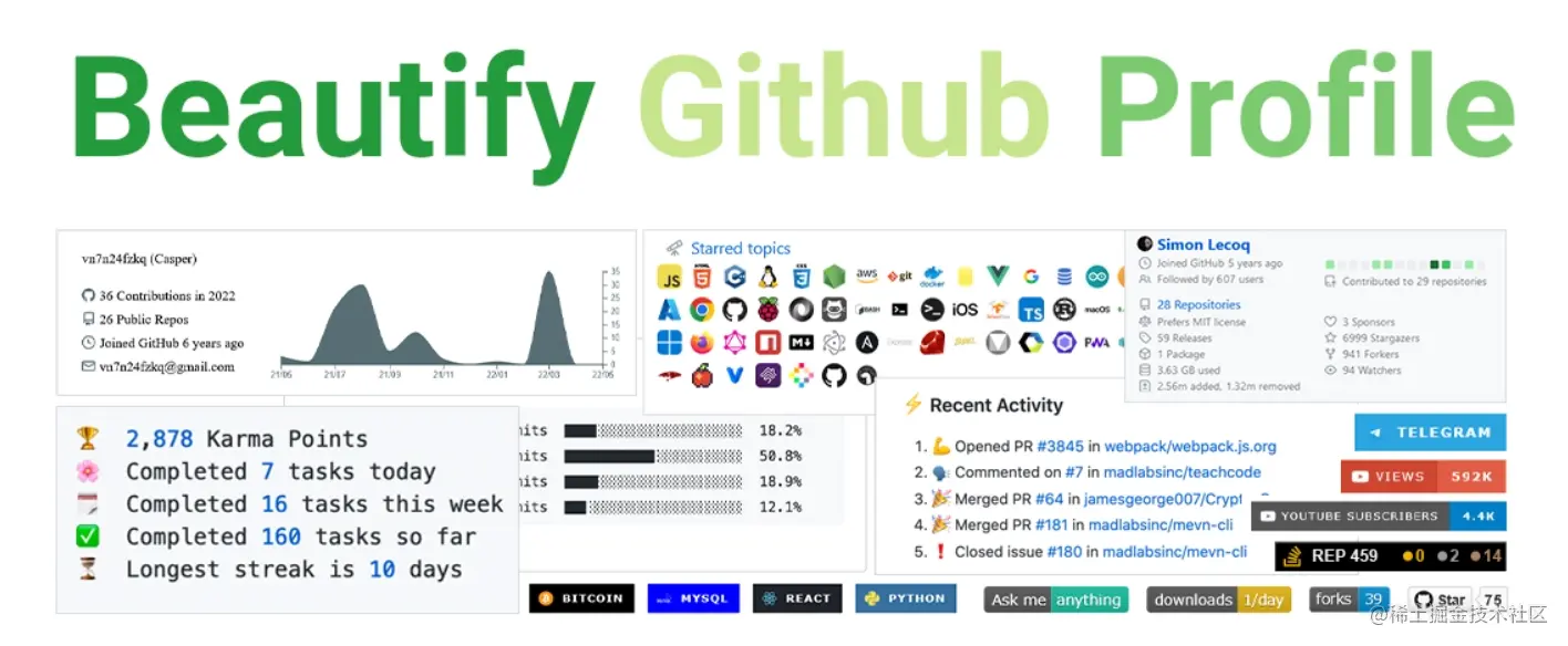 @zhangferry:Github 自定义 Profile 是一个很棒的功能,我们可以用它定制自己的个人介绍页面。它的使用非常简单,建一个跟用户名同名的仓库,该仓库的 README.md 即是 Profile 的展示页面。Github 有很多做的很漂亮的样式都有对应的开源配置链接,该仓库对这类配置进行了收录整理。