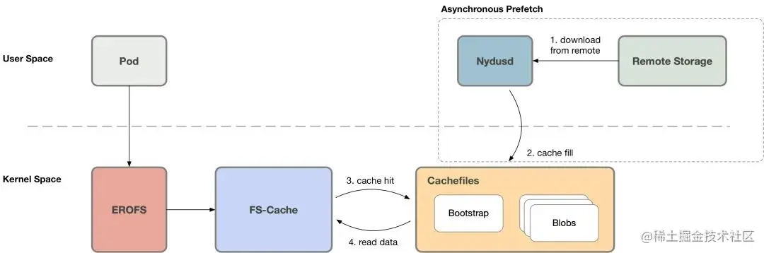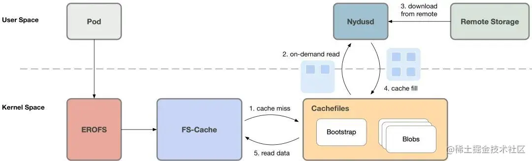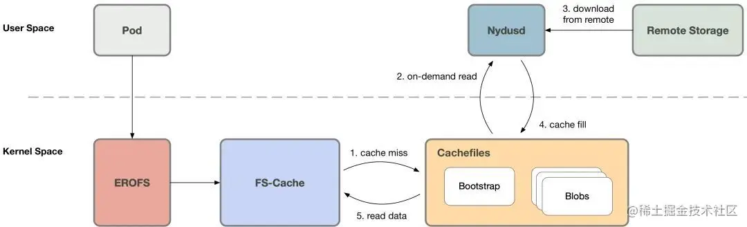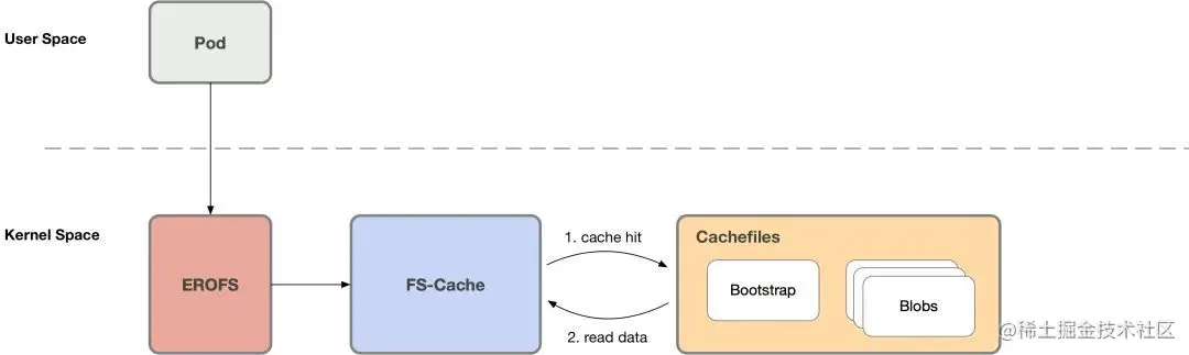 事实上我们可以将按需加载的 1) 缓存管理和 2) 缓存未命中的时候,通过各种途径 (例如网络) 获取数据 ,这两个操作解耦开。缓存管理可以下沉到内核态执行,这样当镜像在本地 ready 的时候,就可以避免内核态/用户态上下文的切换。而这也正是 erofs over fscache 技术的价值所在。