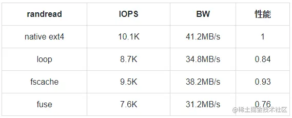 "性能" 一栏对各个模式下的性能进行归一化处理,以原生 ext4 文件系统的性能为基准,比较其他模式下的性能
