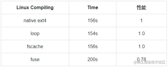 可以看到,fscache 模式下的 Linux 编译负载性能与 loop 模式、原生 ext4 文件系统的性能基本持平,同时要优于 fuse 模式。