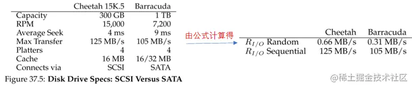 我们以两种情况下的IO请求来说明现代磁盘IO性能的到底是怎样的。两种IO分别是随机工作负载,即将少量(例如,4KB)的数据读取到磁盘上的随机位置,和顺序工作负载,即连续地从磁盘读取大量扇区,而不需要跳转。我们用两款不同定位的硬盘来分别进行实验。硬盘参数和实验结果如下。