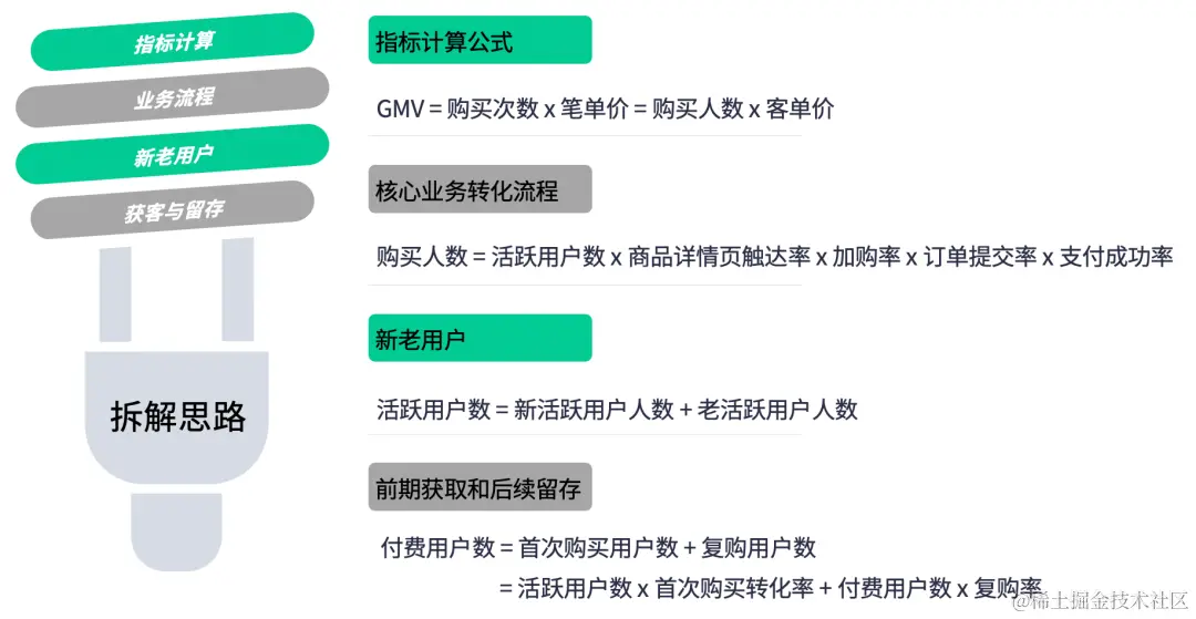 根据以上拆解思路,通过指标计算公式拆解 GMV(成交总额)得出: