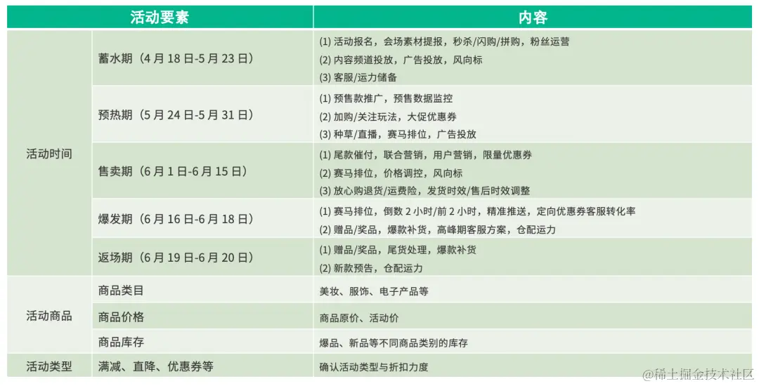 明确活动目标、完成用户洞察后,可以基于活动时间、活动商品、活动类型等要素,梳理活动其余待办内容。