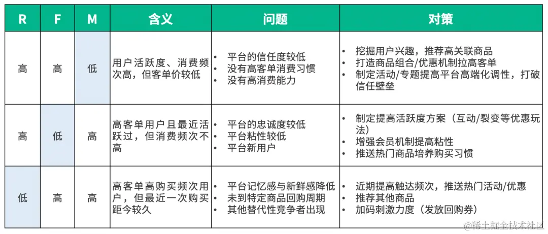 RFM 是指根据用户的交易频次和交易额衡量用户价值,对用户进行细分并针对性地采取相应运营策略进而提升营收水平。