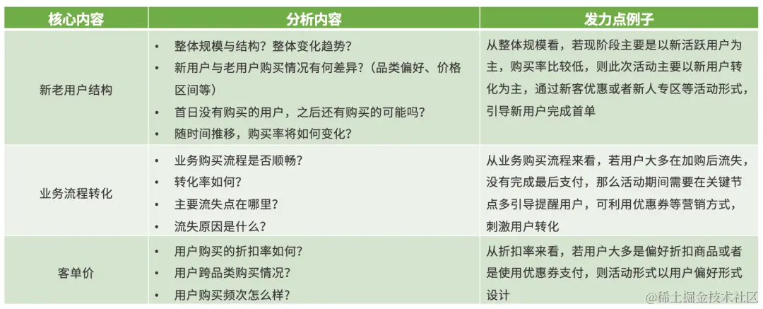 从上述拆解例子来看,拆解后的三大核心内容是新老用户数、业务流程转化、客单价。因此要针对这些核心内容结合历史数据进行分析并予以对应的运营举措。
