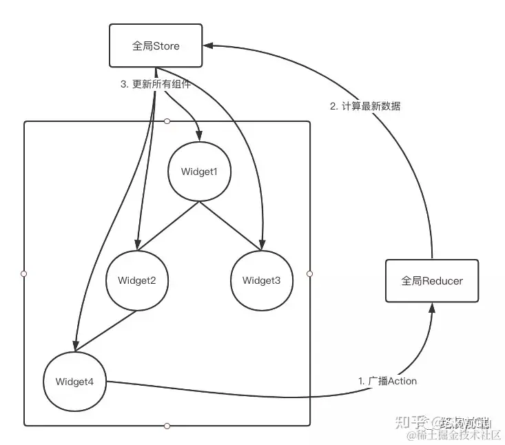 数据更新时,视图组件首先会尝试在自身Store中进行计算并更新自身,当发现缺少数据或更新将影响其他视图组件时,则将数据的改动广播至全局Store处理。