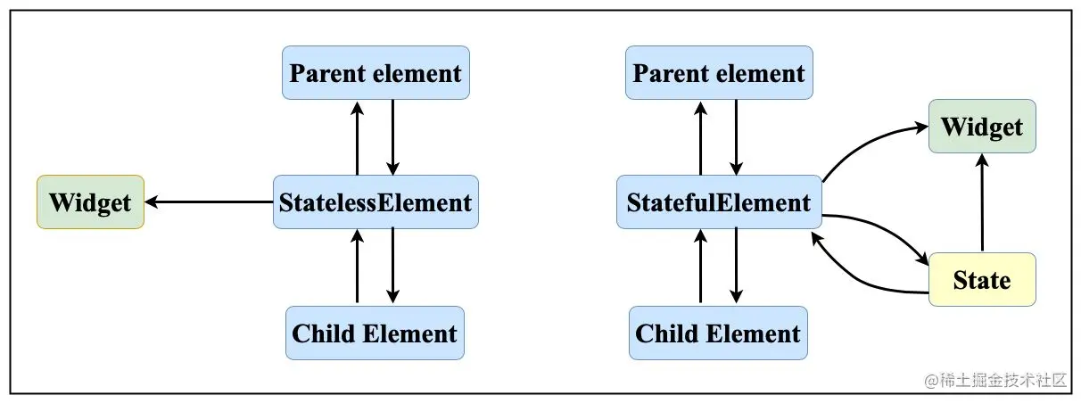 如上文所述,ComponentElement分为StatelessElement和StatefulElement,这两种Element同核心元素Widget以及State之间的关系如下图所示。