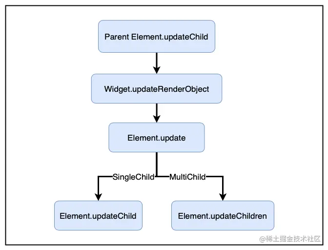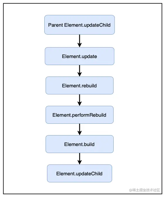 由父Element执行更新子节点的操作(updateChild),由于新旧Widget的类型和Key均未发生变化,因此触发了Element的更新操作,并通过performRebuild将更新操作传递下去。其核心函数updateChild之后会详细介绍。
