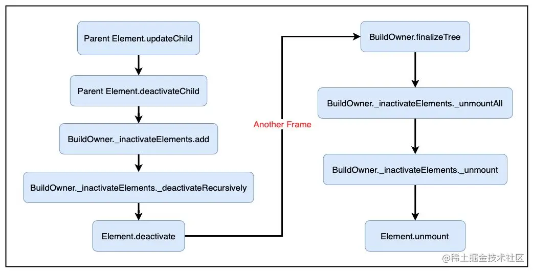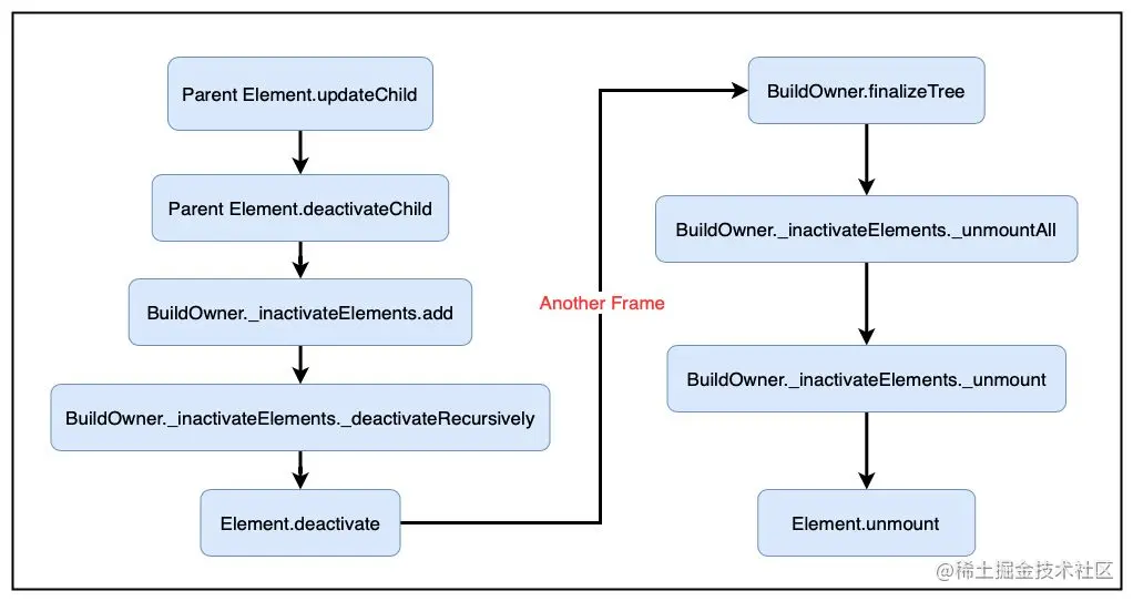 由父Element或更上级的节点执行更新子节点的操作(updateChild),由于新旧Widget的类型或者Key发生变化,或者新Widget被移除,因此导致该Element被转为未激活状态,并被加入未激活列表,并在下一帧被失效。