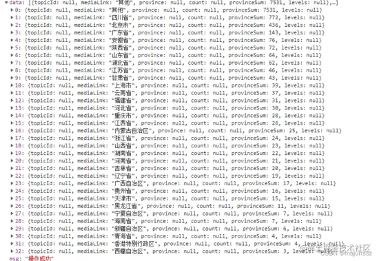 搜索后的数据如下图:(实体类中省份的字段给错了,应该为province),provinceSum为该省份再es索引库中共有多少条数据。
