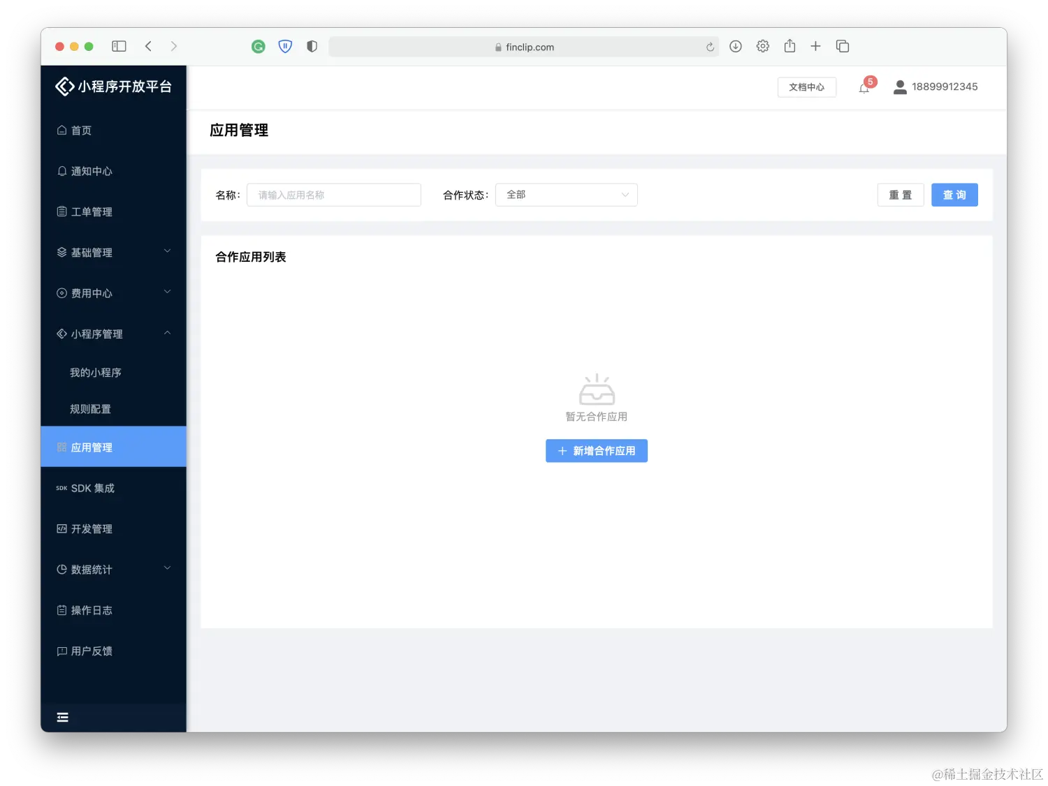 需要登录FinClip管理后台「应用管理-新增合作应用」,完成应用创建;
