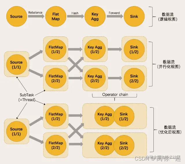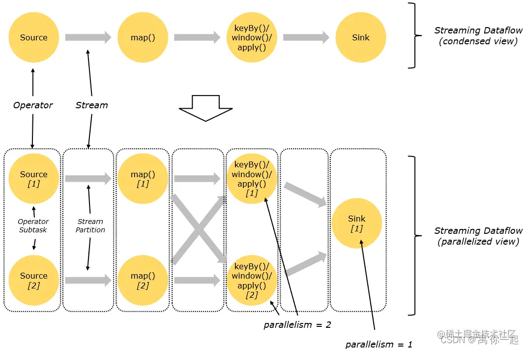 在执行过程中,一个流(stream)包含一个或多个分区(stream partition),而每一个算子(operator)可以包含一个或多个子任务(operator subtask),这些子任务在不同的线程、不同的物理机或不同的容器中彼此互不依赖地执行。