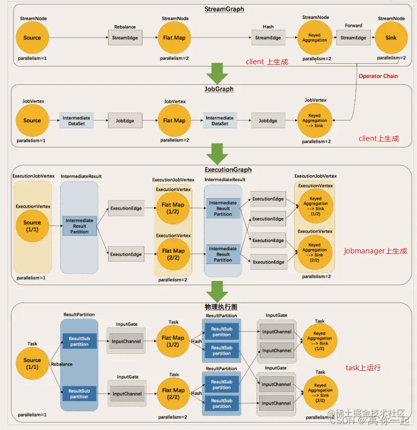 物理执行图:JobManager 根据 ExecutionGraph 对 Job 进行调度后,在各个TaskManager 上部署 Task 后形成的“图”,并不是一个具体的数据结构。