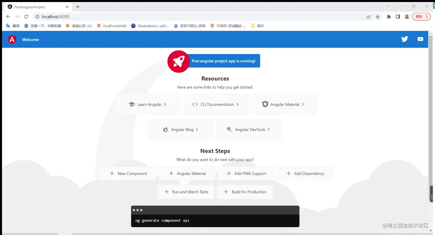 在Resources栏下是一些学习开发的资源, 在Next Steps栏下是一些常用的Angular-cli命令, 目前我也只用过 ng generate component <compont-name>