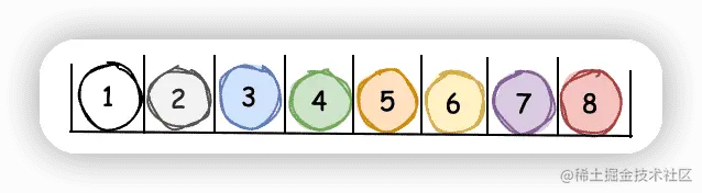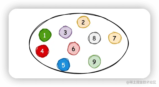 集合结构中的数据元素除了共同属于一个集合之外,元素之间没有其他任何关系,各元素之间是平等的,类似于数学中的集合,如下图所示。