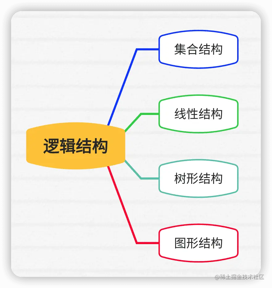 逻辑结构,就是指数据对象中数据元素之间的相互关系。逻辑结构主要又可以分为 4 种,总结如下: