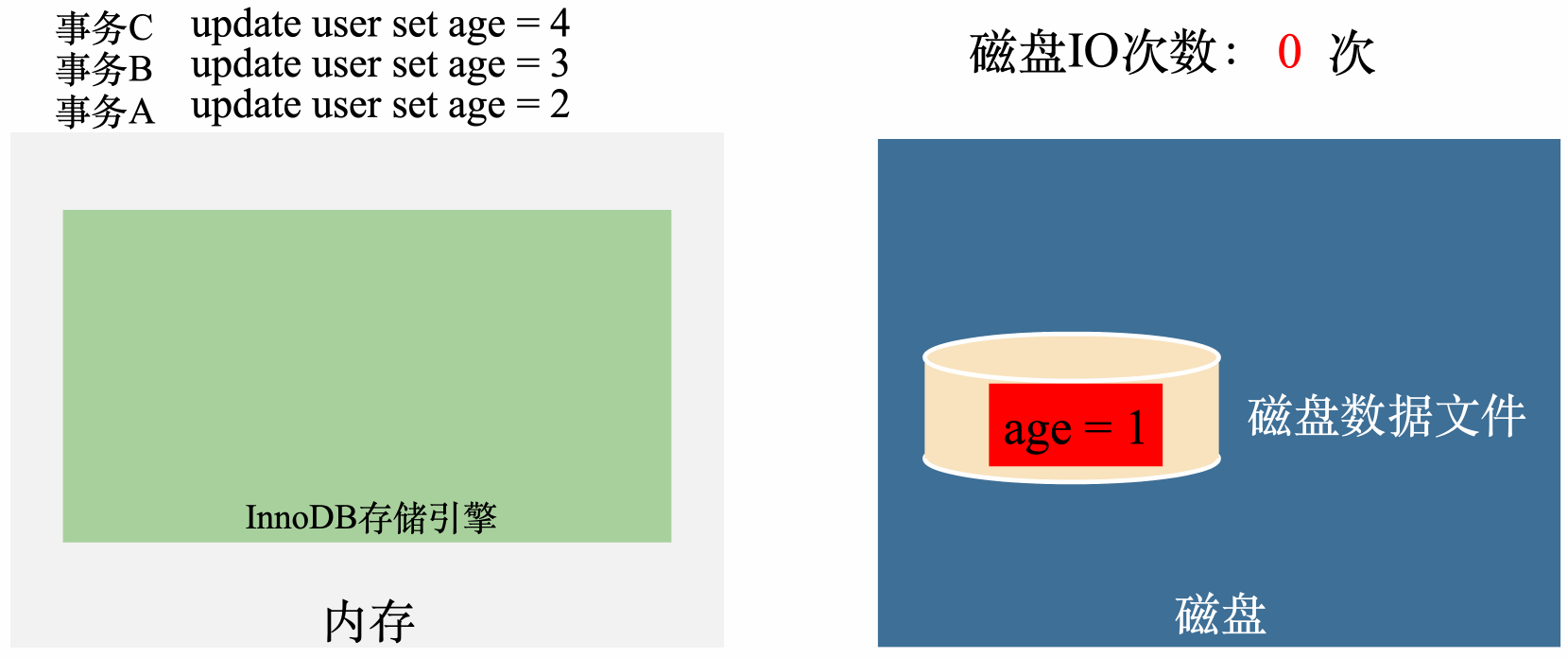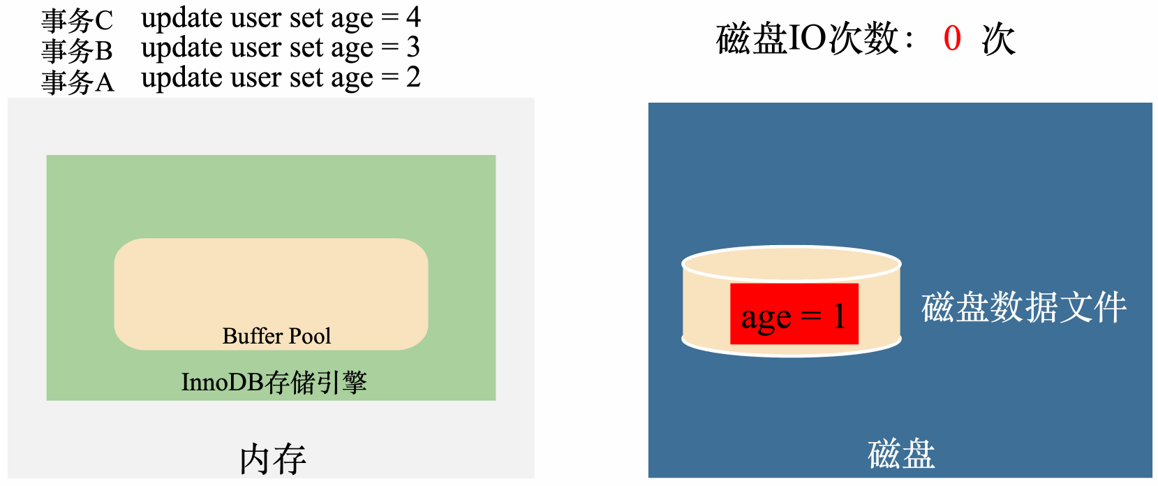 我们通过一个例子说明,我们先假设没有Buffer Pool,user表里面只有一条记录,记录的age = 1,假设需要执行三条SQL: