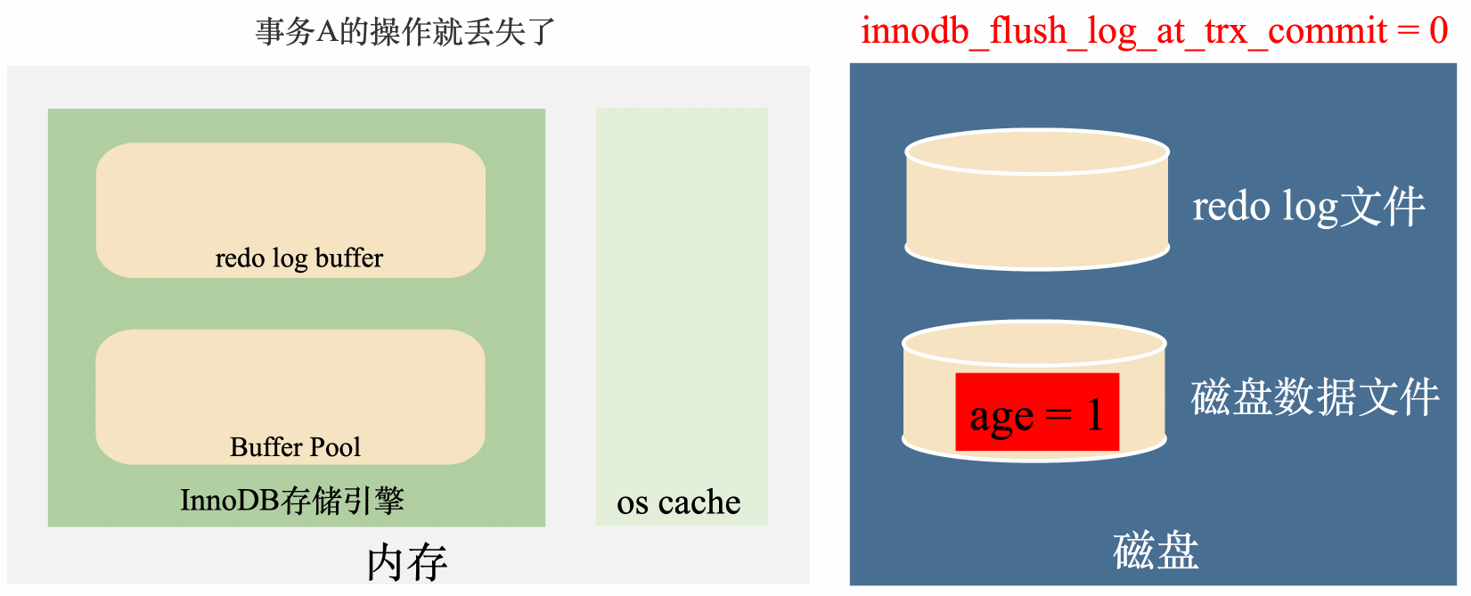 还是上面的那个例子,如果三个事务执行完毕,在age = 4还没有刷到磁盘的时候,突然断电,数据就全部丢掉了: