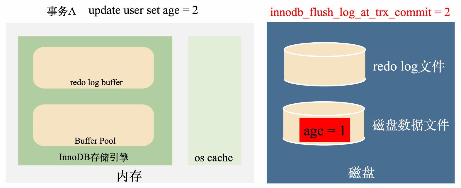 如上图,有了redo log之后,将age修改成2之后,马上将age = 2写到redo log里面,如果这个时候突然断电内存数据丢失,在来电的时候,可以将redo log里面的数据读出来恢复数据,用这样的方式保证了数据不会丢失。