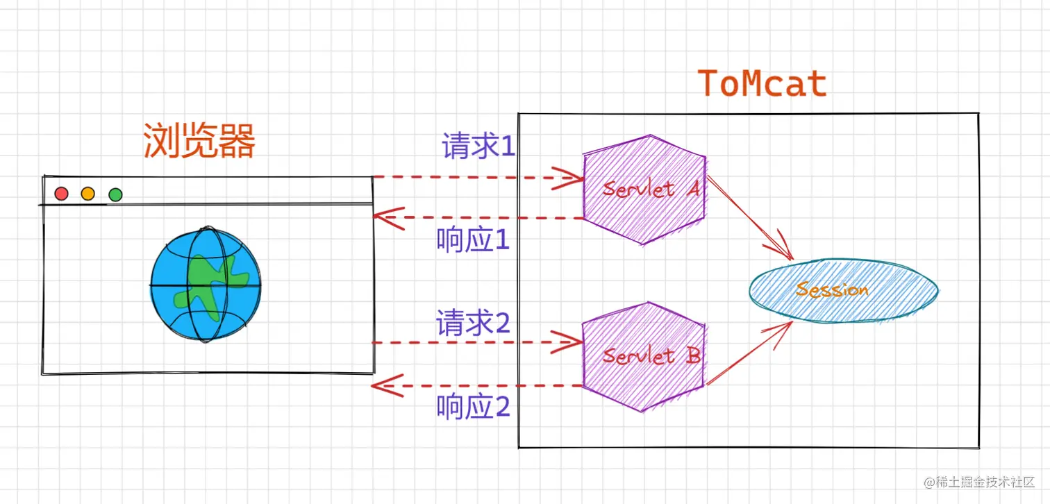 - 就可以实现一次会话中多次请求之间的数据共享了
