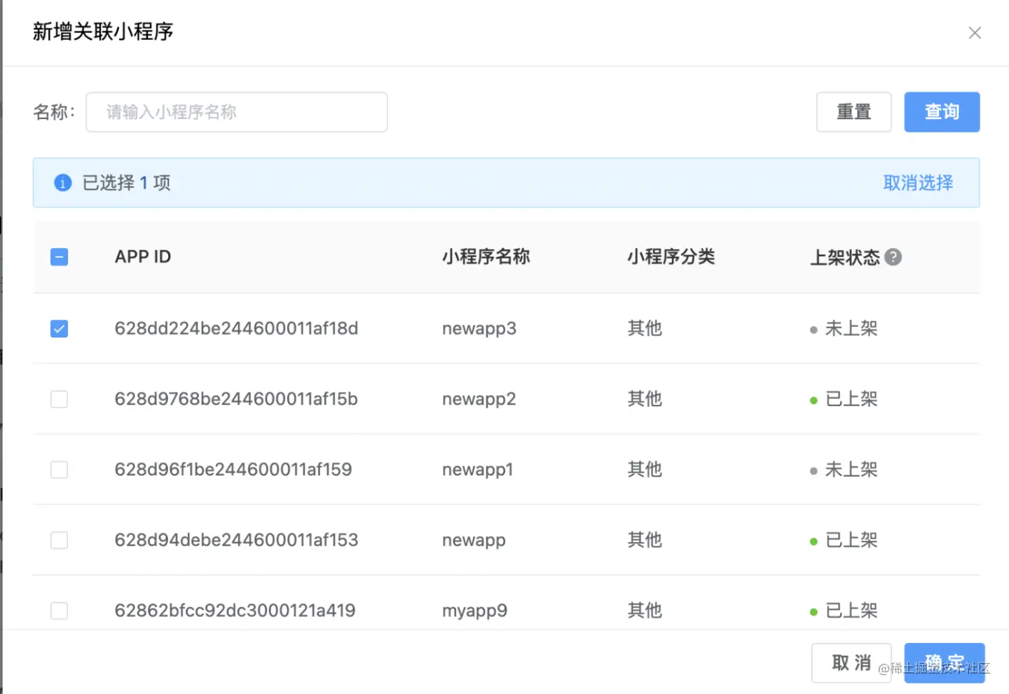 在newapp3一栏点击关联小程序,找到刚刚新建的newapp3,新增关联