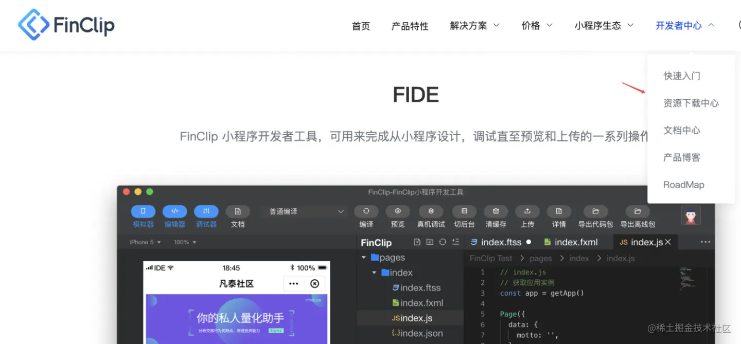 打开FinClip官网www.finclip.com/,在开发者中心->资源下载中心,下载并安装FIDE