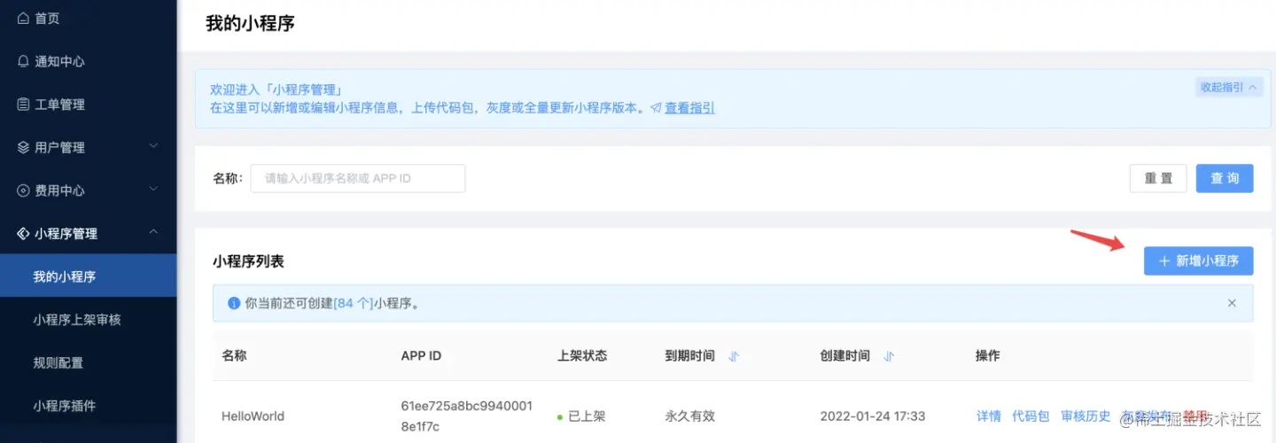 登录finclip官网,在小程序管理->我的小程序新增一个小程序。