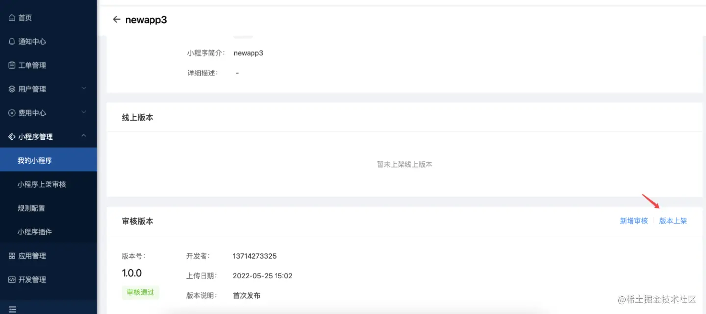 在小程序管理->我的小程序找到newapp3->详情->审核版本->版本上架->确认上架
