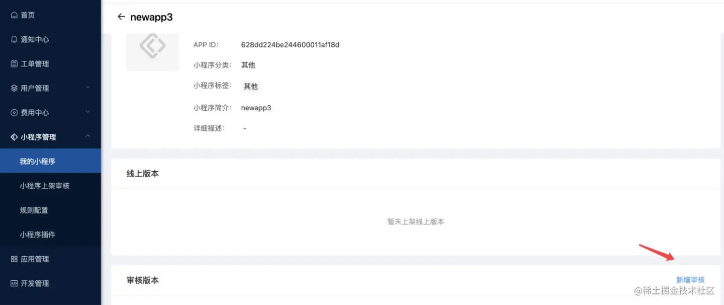 回到finclip官网,在小程序管理->我的小程序找到newapp3->详情->审核版本->新增审核