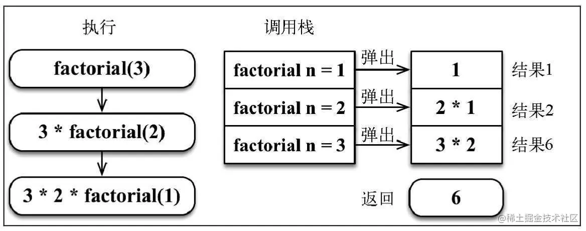 当factorial(1)返回1时,调用栈会开始弹出调用,返回结果,直到3 * factorial(2)被计算。