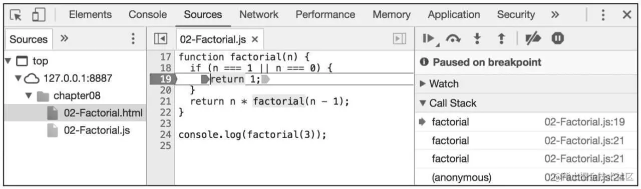 如果执行factorial(3),打开浏览器的开发者工具,打开Sources标签页,在Factorial.js文件中增加一个断点,当n的值为1时,我们可以看到Call Stack里有三个factorial函数的调用。如果继续执行,会看到当factorial(1)被返回后,CallStack开始弹出factorial的调用。