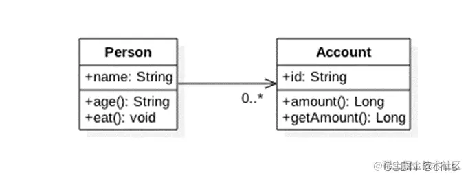 如这里表示一个人可以关联0或多个account,且只有Person知道这种关联,并且Account可能作为属性出现在Person中,Person很可能引用Account的全局变量id
