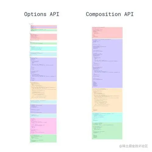 - 组合式api,代码定义很自由,相同功能代码整合到一起,查找修改都很方便。