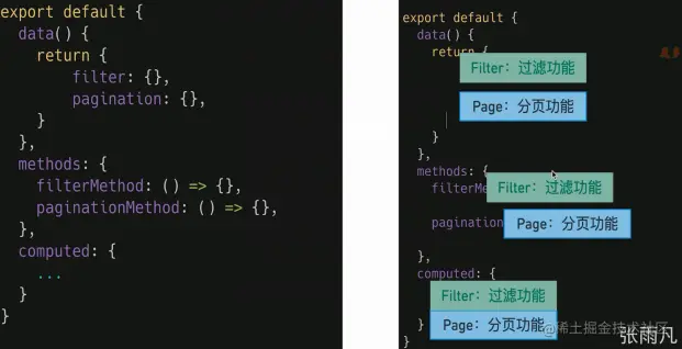 比如我们在一个组件中有两个大的功能,过滤功能和分页功能,逻辑拆分之后写到对应的选项中,由于两个逻辑写的过于复杂,变得难以维护,我们需要通过一些优化手段来优化我们的代码。