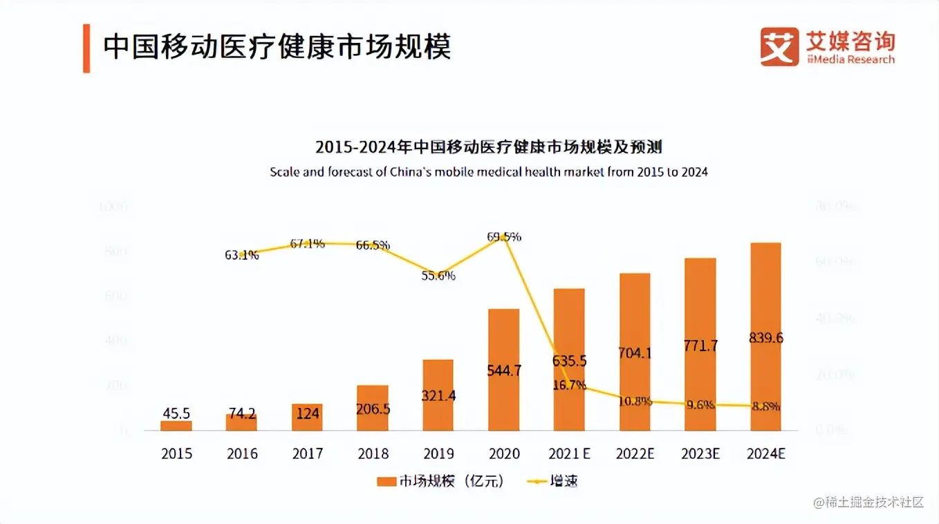 与行业起步初期相比,在线医疗行业可谓发生了翻天覆地的变化。据艾媒咨询统计,2020年国内在线医疗健康市场规模达到544.7亿元,预计在2021年突破635.5亿元。