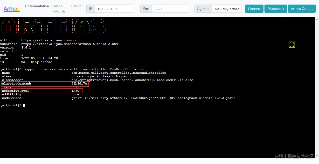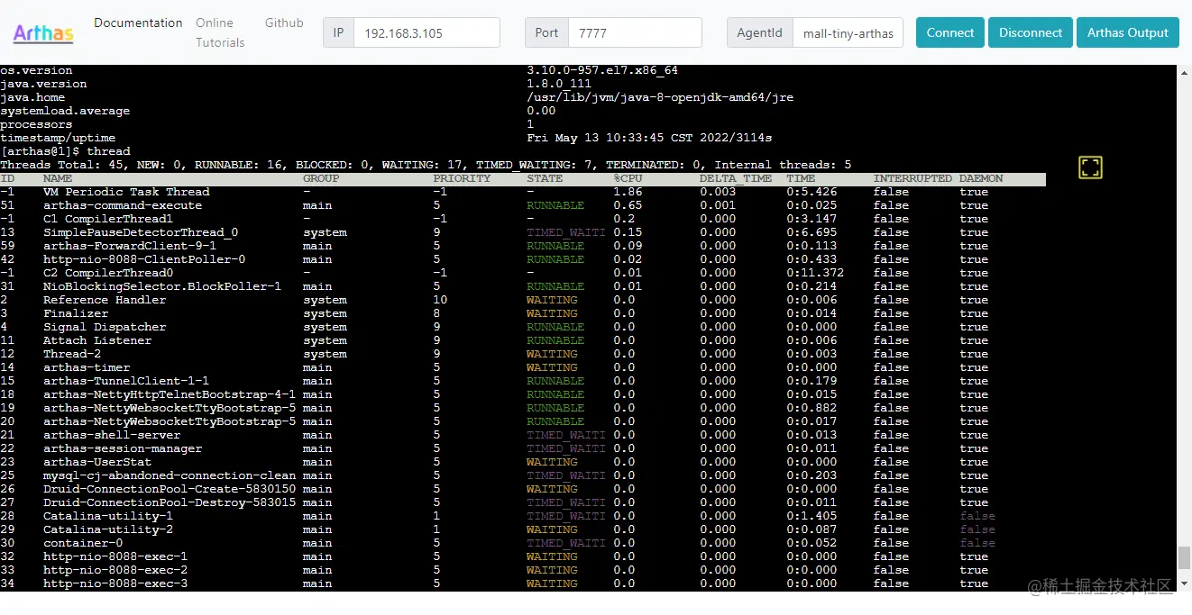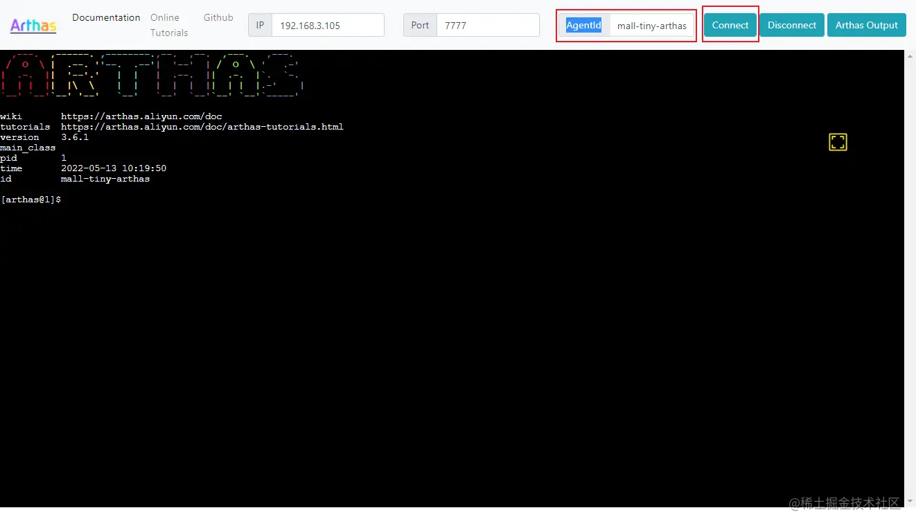 ArthasTunnel的Web控制台中输入AgentId为mall-tiny-arthas,并点击Connect按钮即可开始诊断Java应用了;