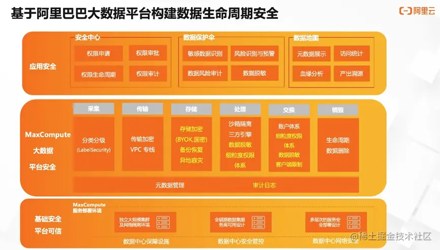 MaxCompute产品集成了众多数据安全能力,可分以下三个层面: