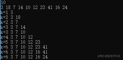 前两行为数据,后10行为遍历到第i个数时 对应的k值(及当前b[]的长度值)及对应b[]中数据