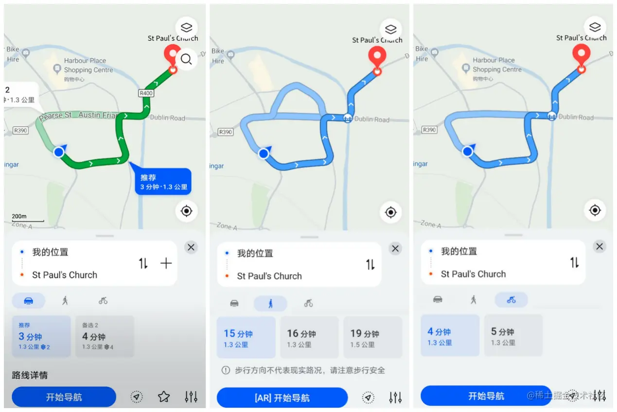 地图服务提供3种交通工具,驾车、骑行和步行。根据不同的交通工具,能快速计算出几种合适的路径规划方案,给出距离及预估到达时间。