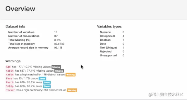 其实,Pandas中df.describe()和df.info()函数也可以实现数据探索过程第一步。但它们只提供了对数据非常基本的概述。而Pandas中的Profiling功能简单通过一行代码就能显示大量信息,同时还能生成交互式HTML报告。