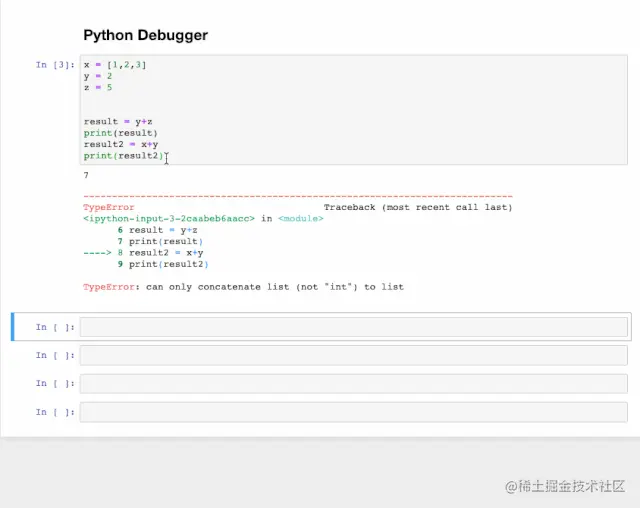 交互式调试器也是一个神奇的函数,如果在运行代码单元格时出现报错,可以在新行中键入%debug运行它。这将打开一个交互式调试环境,自动转到报错发生的位置,并且还可以检查程序中分配的变量值并执行操作。要退出调试器,按q。比如下面这个例子。