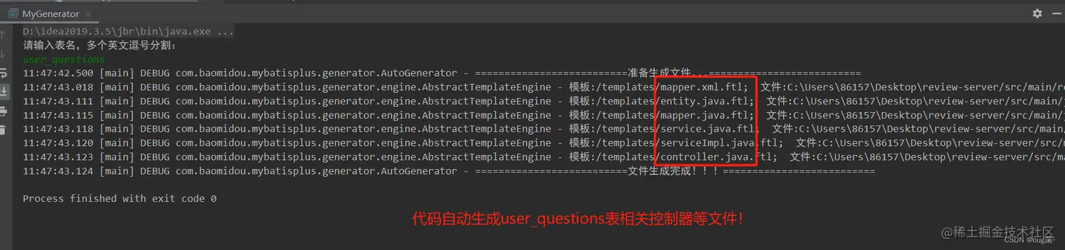 我直接运行MyGenerator中的main主函数。然后输入sys_questions后回车。你们可以看到,如下截图,直接就已经对应生成好了那些文件。