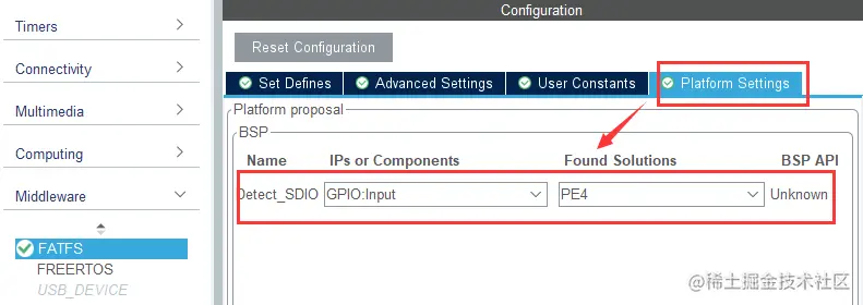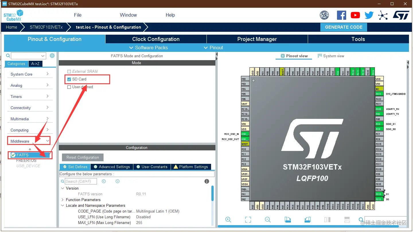 在 Middleware 中选择 FATFS 设置,并勾选 SD Card 配置为SD卡