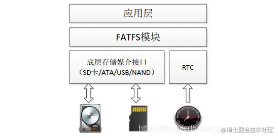 最底层是FATFS模块的底层接口:包括存储媒介读写接口和供给文件创建修改时间的实时时钟,需要在移植时编写对应的代码