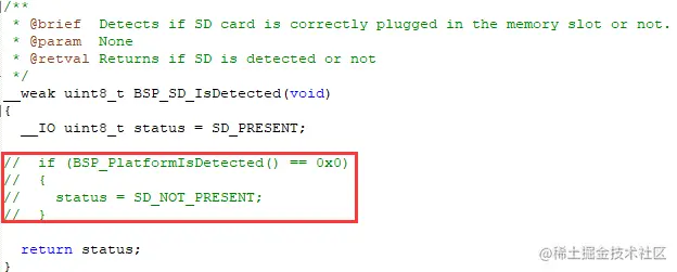 由于没有检测SD卡插入的硬件引脚,打开 bsp_driver_sd.c 文件,修改 BSP_SD_IsDetected() 函数,始终返回SD_PRESENT:
