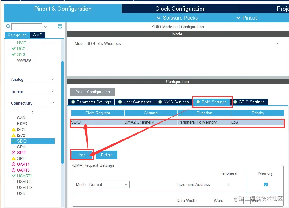 点击 DMA Settings 添加 SDIO 对应 DMA2 的通道4。DMA模式选择循环模式,方向选为内存到外设。