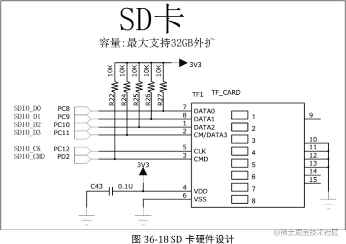 STM32 控制器可以控制使用单线或 4 线传输,本开发板设计使用 4 线传输。