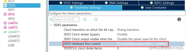 SDIO hardware flow control: The hardware control flow is disabled。硬件流控制选择,可选使能或禁用,它设定 SDIO_CLKCR 寄存器的 HWFC_EN 位的值。硬件流控制功能可以避免 FIFO 发送上溢和下溢错误。