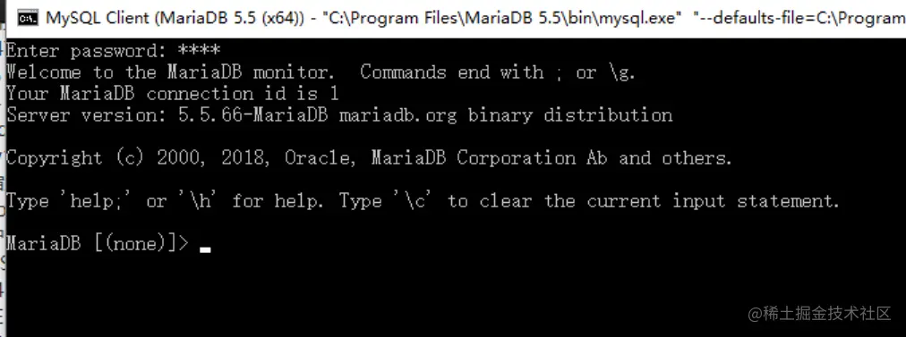 1.从开始菜单中找到 MariaDB 里面的 MySQL Client 运行,输入密码 root 后回车 提示以下信息说明连接成功!