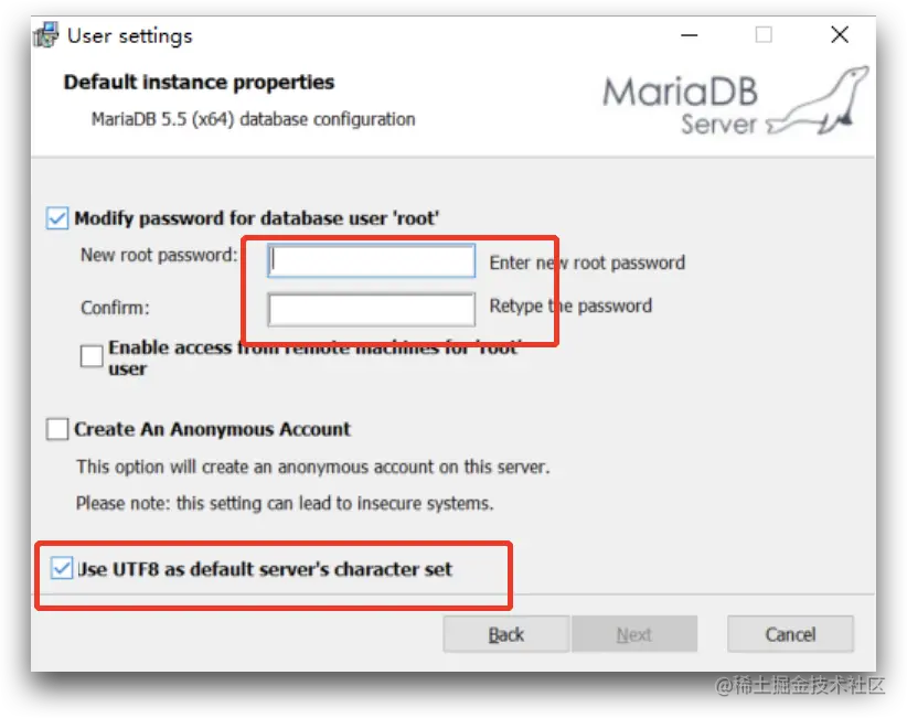3.安装过程中可以设置密码为 root, 设置默认字符集 UTF-8